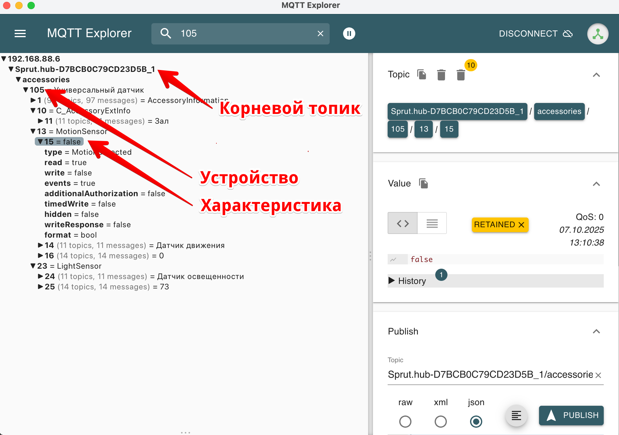 - После подключения вы увидите структуру всех доступных топиков. Найдите те, что начинаются с префикса, например, Sprut.hub-****/accessories.