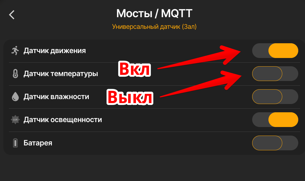 - Включите переключатели напротив тех характеристик, которые нужно отправлять в MQTT-брокер.