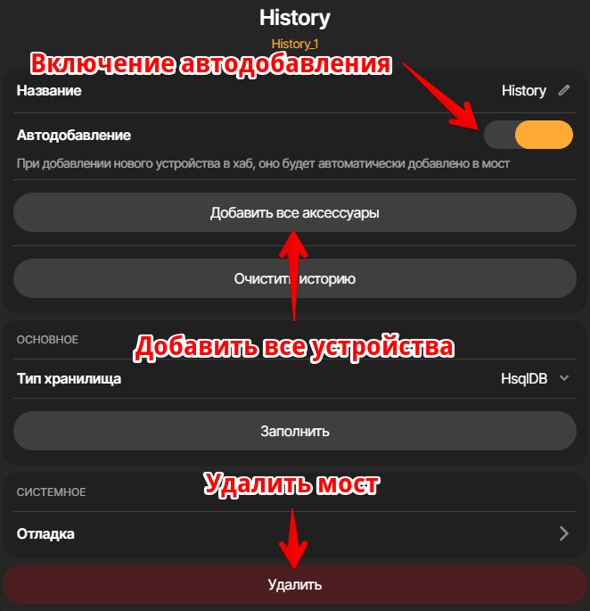 Если вы хотите чтобы история работы всех существующих устройств сохранялась, вам необходимо зайти в настройки моста History и добавить все устройства.