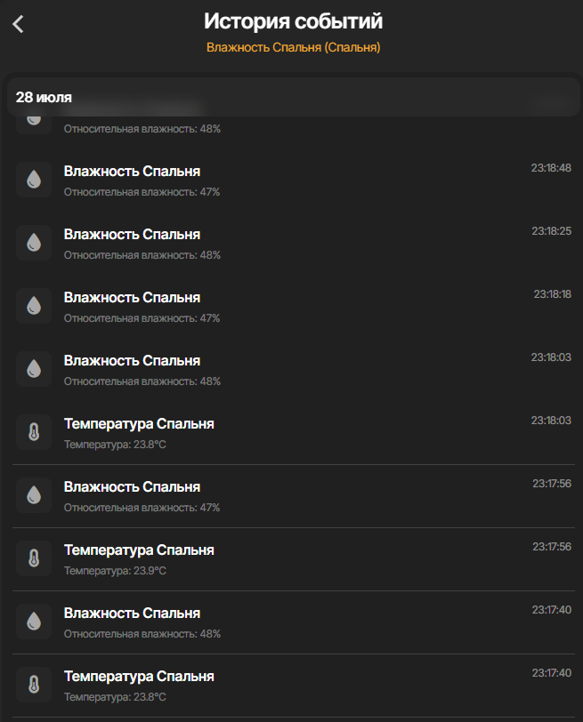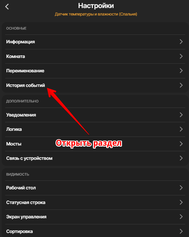 Если вы хотите посмотреть историю работы всех характеристик устройства (если у него их несколько), то вы можете зайти в настройки устройства и открыть раздел История событий, где отображаются все события всех характеристик этого аксессуара.