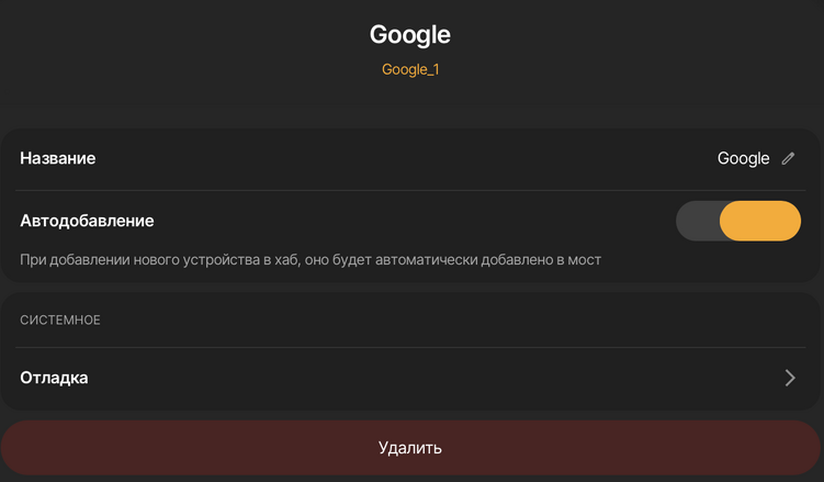 По умолчанию, во всех создаваемых мостах включена функция автодобавления устройств. Это означает, что при создании или подключении нового устройства - оно будет добавлено автоматически в перечень отправляемых в Google устройств