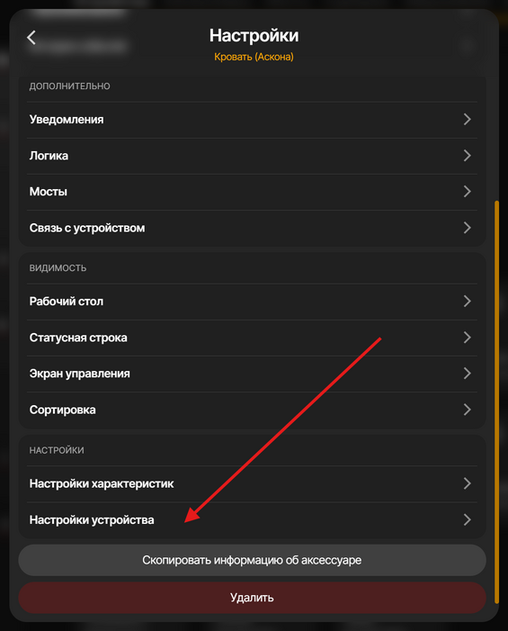 Далее выбрать пункт "Настройки устройства". Это откроет окно настроек устройства Bed.box.